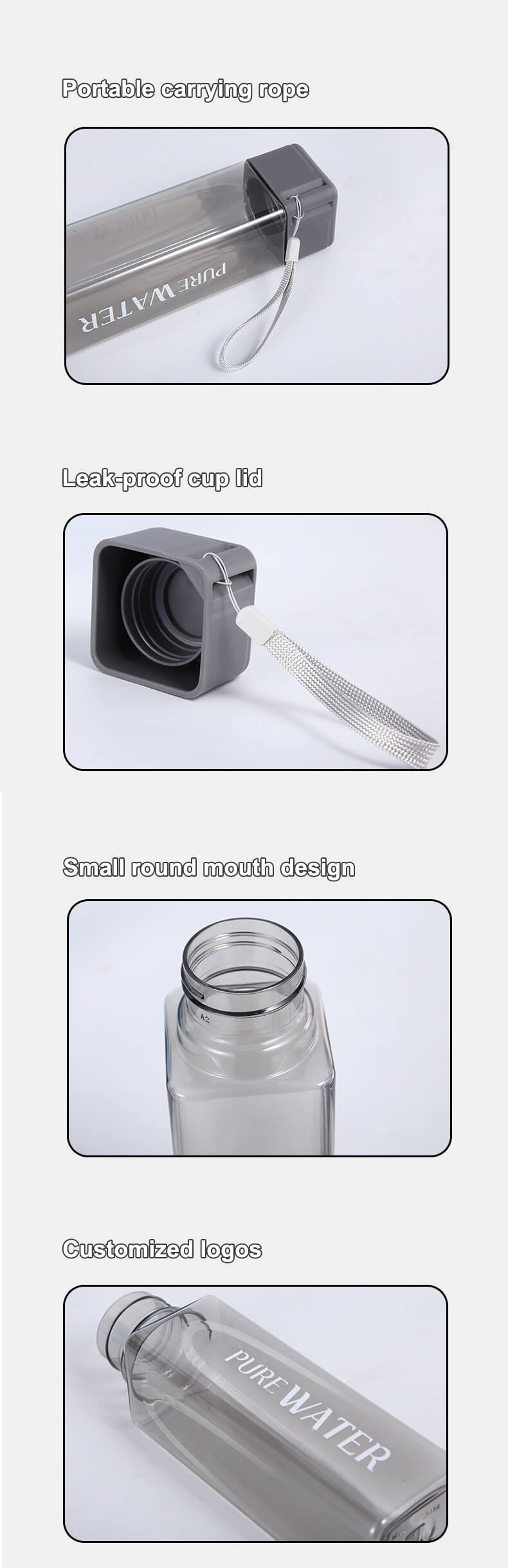 Custom logo Hot Selling Clear Frosted Square Portable Plastic Water Bottle with Rope
